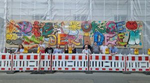 Alle Partizipierenden gestalteten mindestens einen Buchstaben und sprühten ein weiteres Motiv auf die Plane. Erst gab es Skizzen auf dem Blatt, dann die Konturen auf der Plane und zum Schluss entstand dieses bunte und farbenfrohe Banner, das für eine zukünftige lebendige Börse steht. Bei der Graffiti-Gestaltung haben die Jugendlichen ihre Wünsche für die Börse eingebracht. Schach spielen, moderne Musikveranstaltungen und Theater fänden sie toll – so die Jugendlichen. Symbole zu genau diesen Wünschen lassen sich finden.